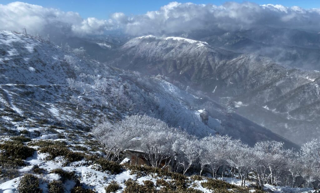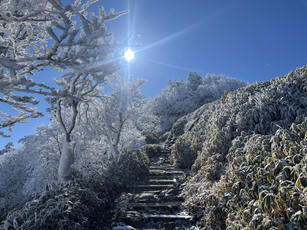 特に、朝日に照らされた霧氷は淡いピンク色に染まりとても幻想的です。