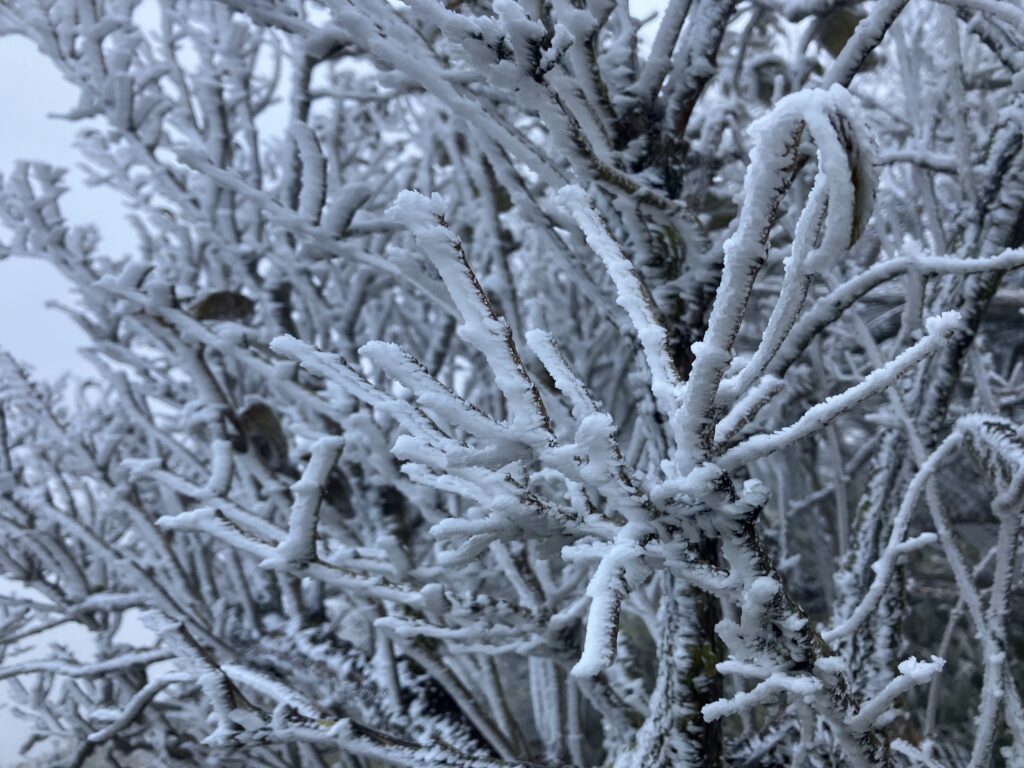 霧が枝などにあたり凍りつき、白い花が咲いたようにみえる現象です。